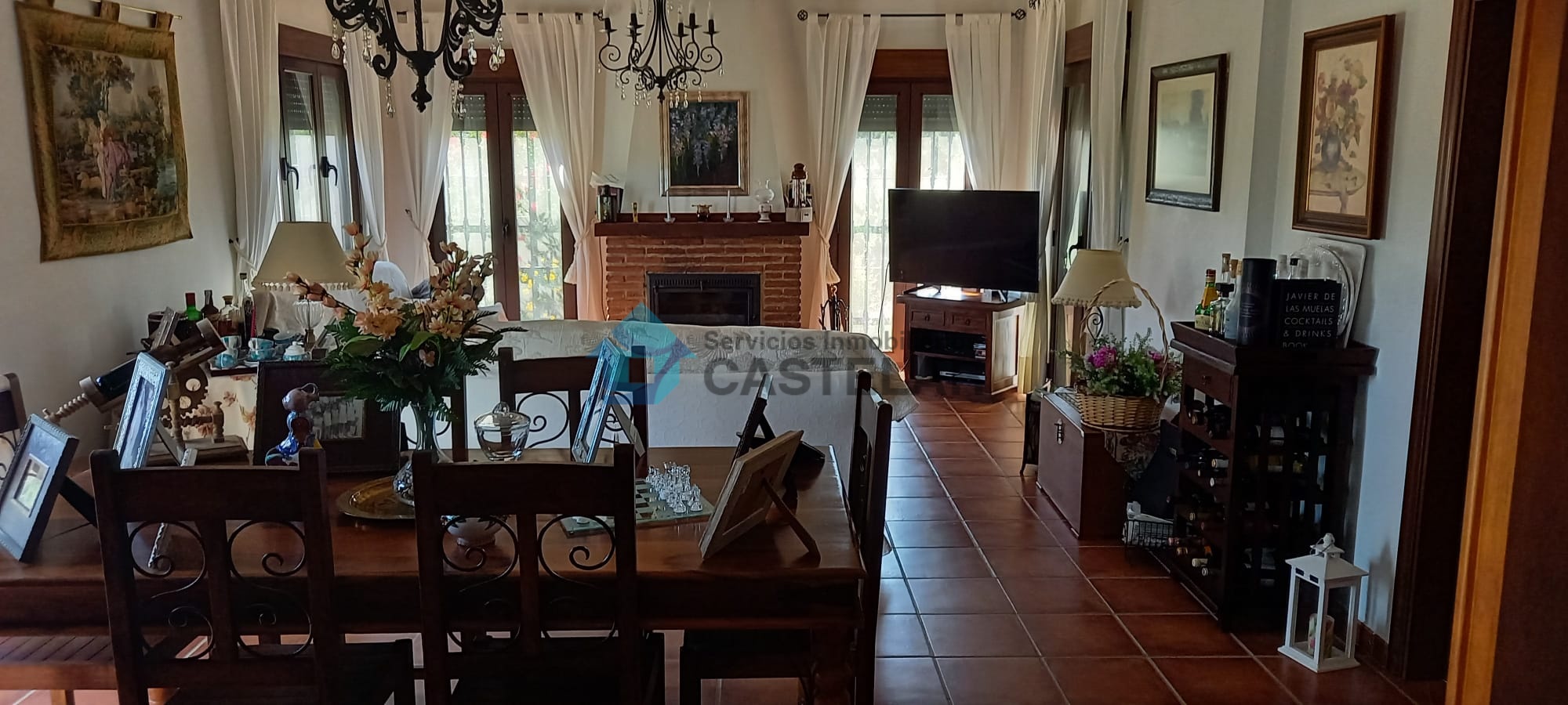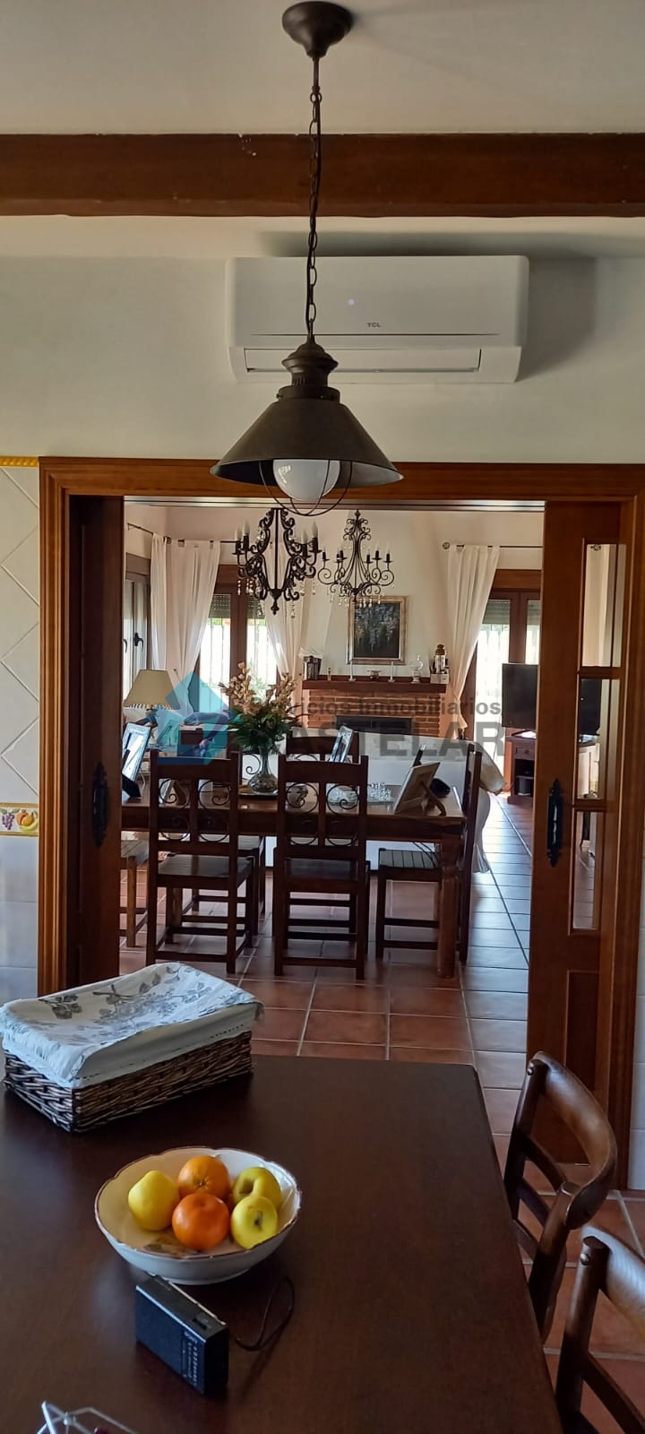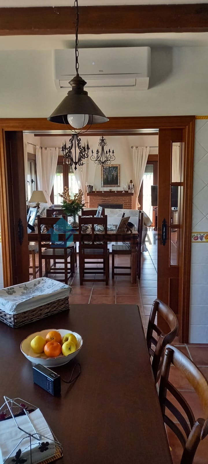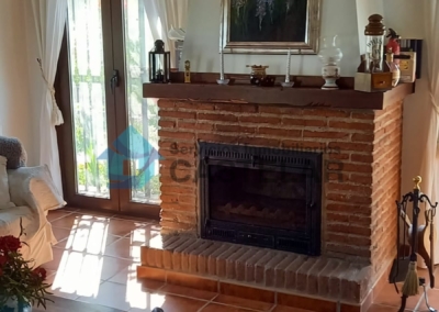 Amplio salón-comedor con chimenea de leña y equipo de climatización.