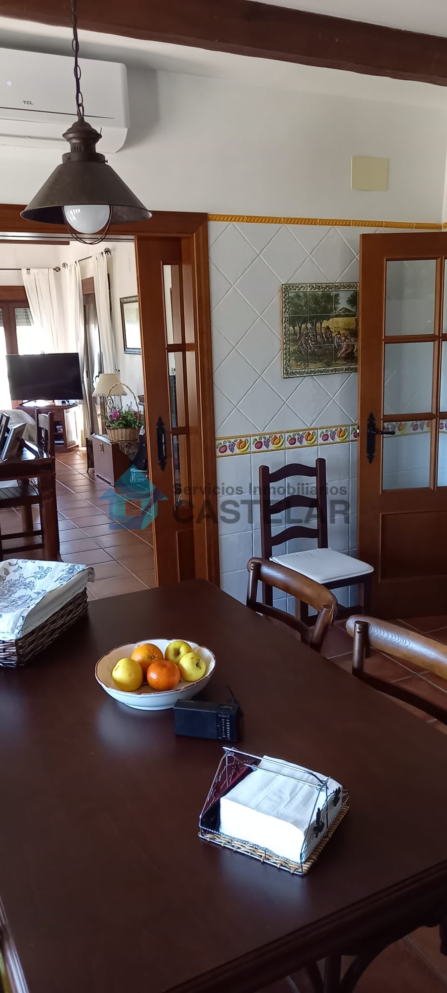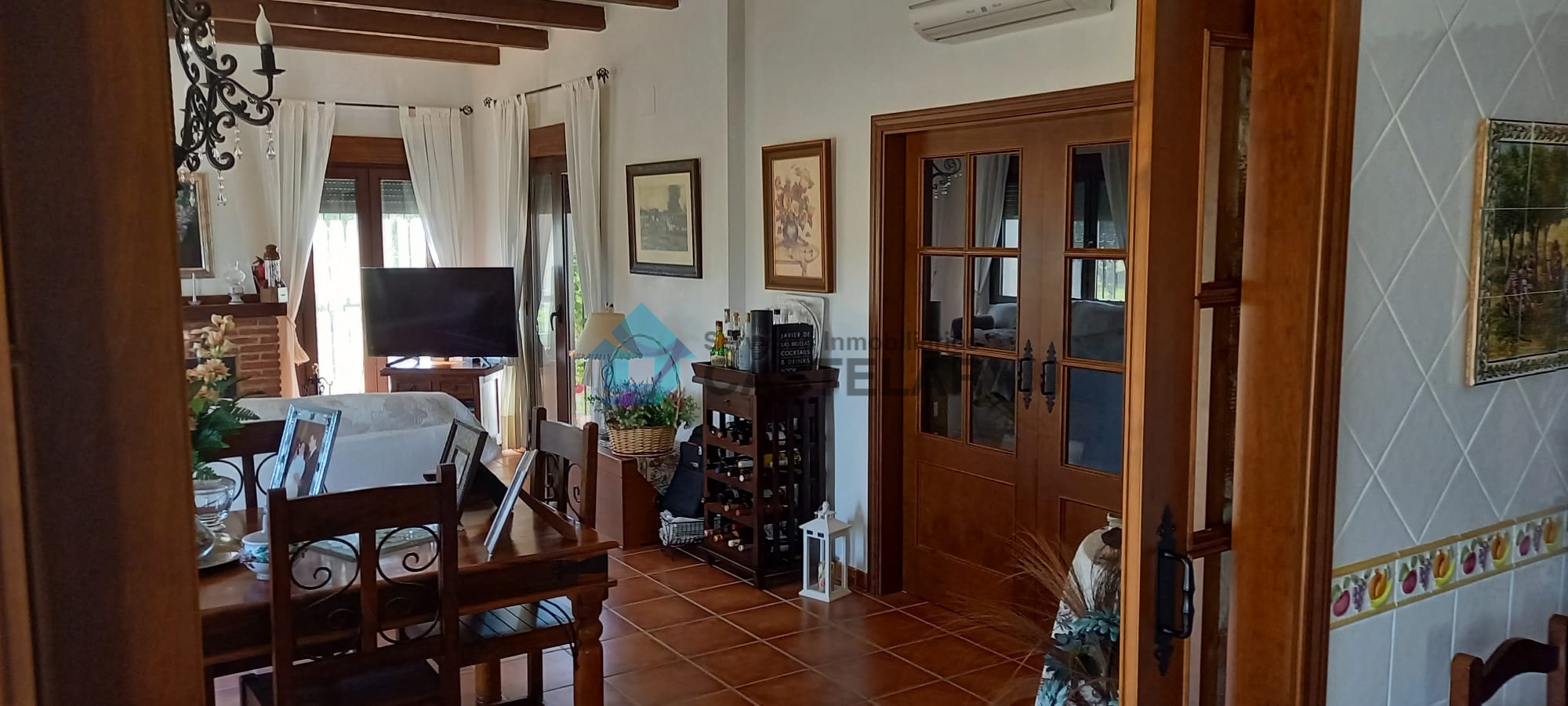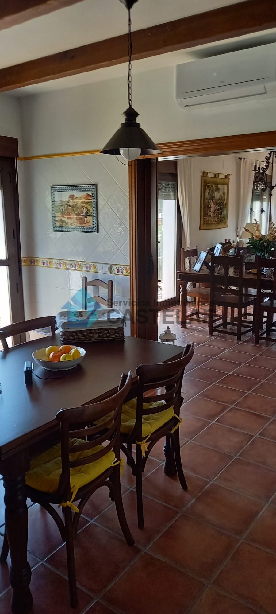 Amplio salón-comedor con chimenea de leña y equipo de climatización.